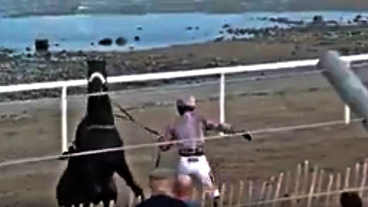 As you can see right as the jockey gets on, he rears but then jumps in the air! The jockey is unseated but he still manages to lands on his feet and he handles his rebellious mount, he really knows this horse very well and clearly understands his language.