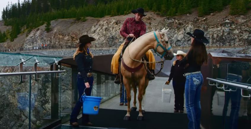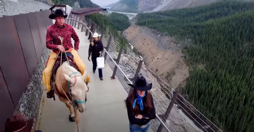 Let’s imagine somebody who is afraid of heights and take him to the Glacier Skywalk at Jasper National Park in Alberta, Canada. It isn’t the best place to be, is it? But what about horses who are so easily spooked? This is what the Canadian trainer David Cowley does with his horse. He takes it in a unique ultimate test of trust, riding it 918 feet above the valley floor on the Glacier Skywalk for the first and possibly only time this will ever happen.